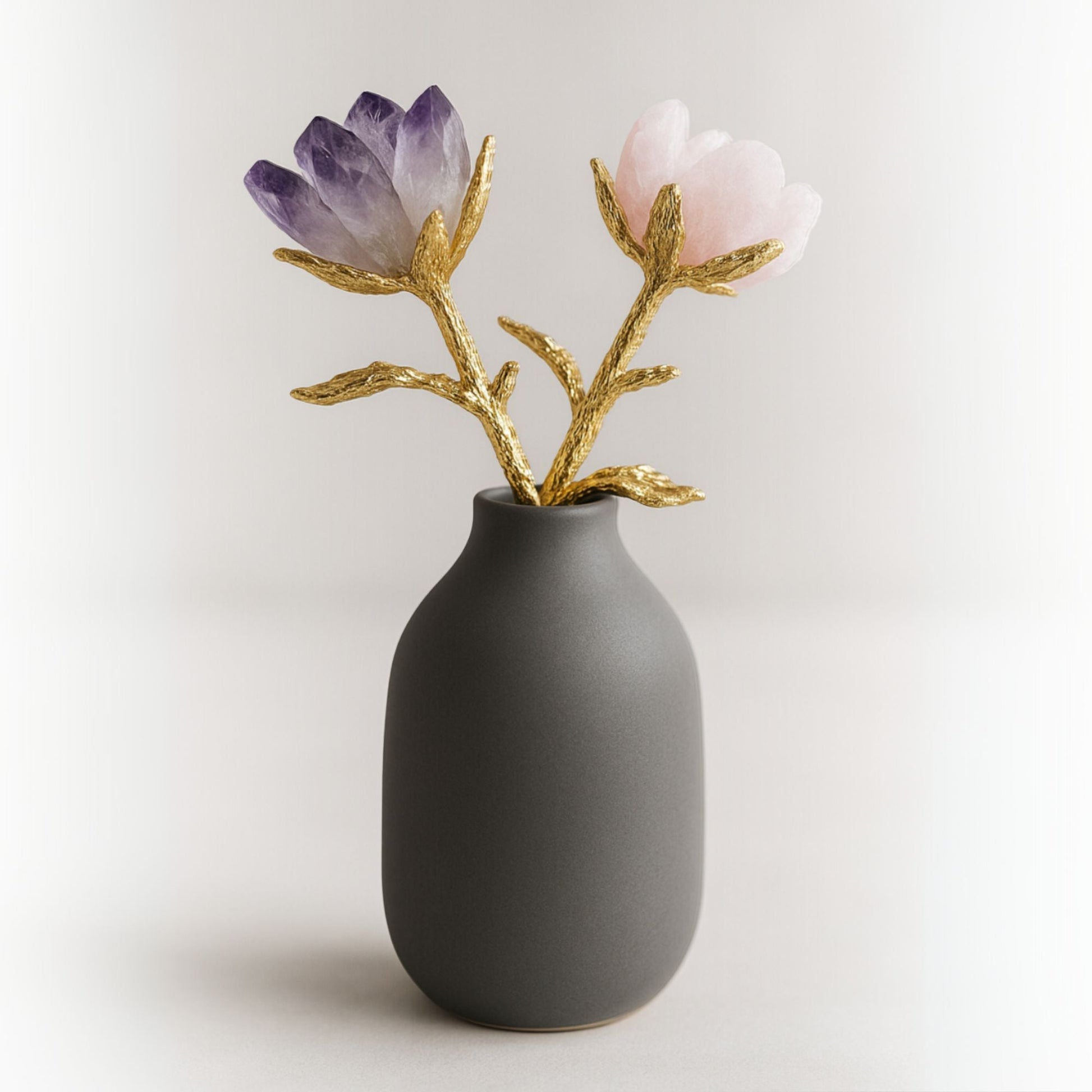 Această trandafir decorativ, realizat manual, este confecționat din petale sculptate din cuarț roz / ametist autentic și are o tulpină metalică aurie, bogat detaliată. Cuarțul roz și ametistul sunt pietrele iubirii și ale armoniei, ceea ce face ca acest trandafir să fie un cadou perfect pentru ocazii speciale sau un element elegant de decor interior.